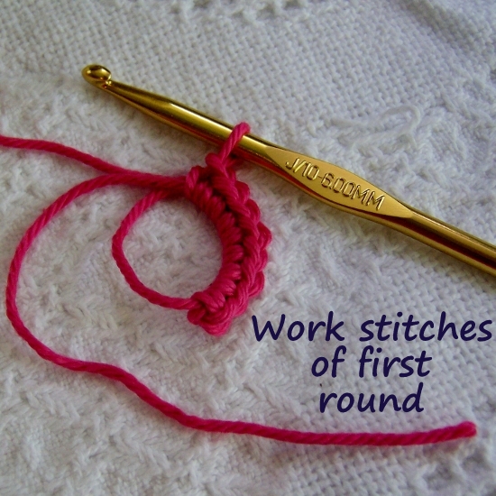 4) Work stitches of 1st round (sc here) over both BOTH strands of yarn and pull tight with the END strand.