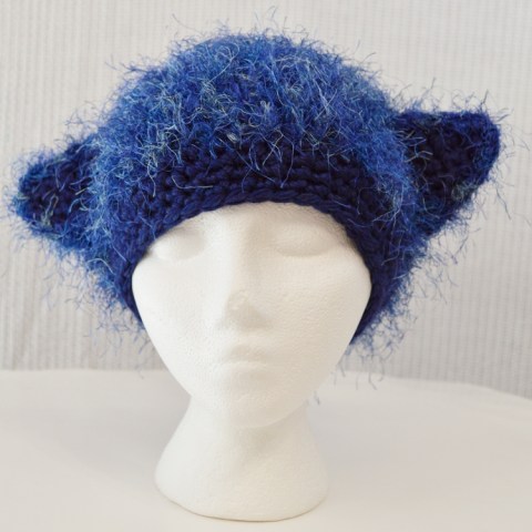 December 31, 2014 and my last hat of the year for the 2014 Stash Bust Challenge was just finished.  I didn’t think I’d have time for another hat this year but then remembered this hat I had started a couple of months ago and hadn’t finished.  There’s a reason I didn’t finish it…fun fur/eyelash yarn.  I’m not a fan of this type of yarn but for some reason (clearance aisle a few years ago!) there are a few skeins of this stuff in my possession. UGH.  There’s no pattern for this critter.  I just made a hat.  As it progressed it was kinda large so I added some super bulky yarn as an edging to tighten it up.  Then, to use up what was left, made some ears-why not?-to create a critter of some sort.  The edging part is pretty tight on Buffy’s head so I’m hoping it will fit a large child.  The good news is I used up all the super bulky and the dark blue fur yarn, less than a yard leftover of each, and created a hat some child will (hopefully) like. The bad news, I have more of this fur stuff, lots more.